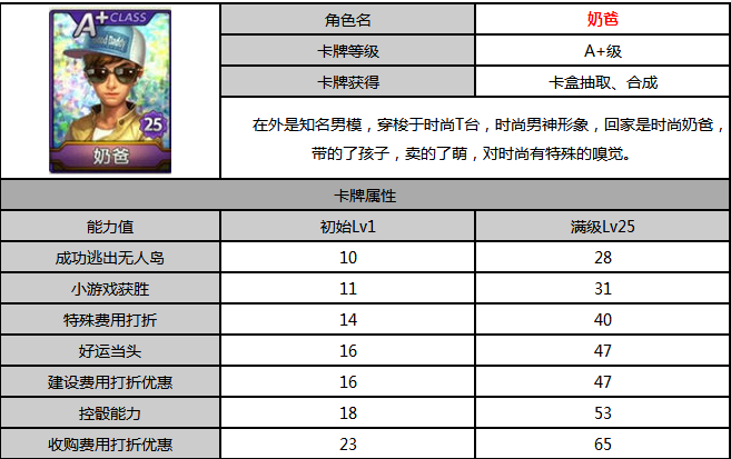 奶爸是个属性十分平衡的角色卡,其中控骰能力和收购费用打折优惠属性较为突出,总体而言属性十分不错。