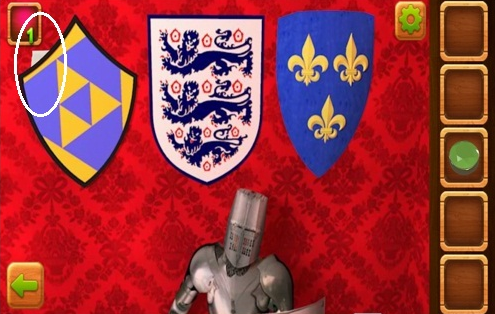 在左边的墙上有三个盾牌图样,第一个盾牌后面有块白布,点击拾取。