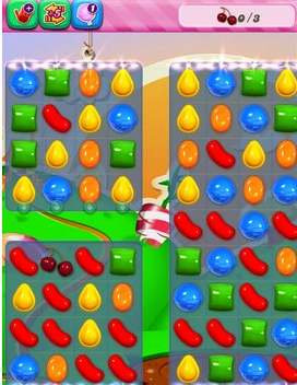 4.右边上方的横纹糖果同样会影响到左上方,可以让左上方无法交换的时候影响整个布局,甚至将果子下面的横排都消掉。