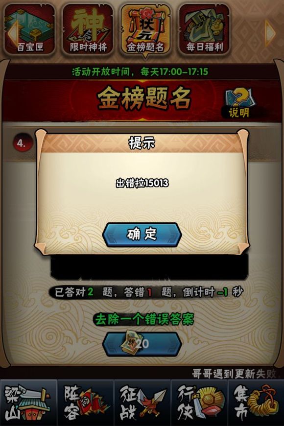 近来不少《全民水浒》的玩家小伙伴在金榜题名答题过程中出现了“出错啦15013”(见下图)的界面提示,这是怎么回事呢?全民水浒金榜题名出现15013怎么办呢?下面小编就为大家带来全民水浒bug之一的问题解决办法,一起来看看吧!