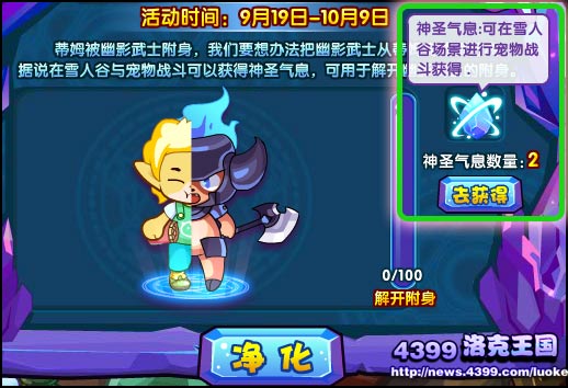 2、前往雪人谷和场景宠战斗获得神圣气息!然后就可以回来净化蒂姆啦!净化成功如下: