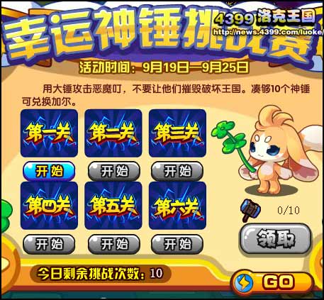 洛克王国幸运神锤挑战赛活动在9月19日开始了,9月19日-25日活动期间,用大锤攻击恶魔叮,获得10个神锤就可以兑换萌宠加尔了,下面东坡小编就给大家详细介绍洛克王国幸运神锤挑战赛玩法吧。