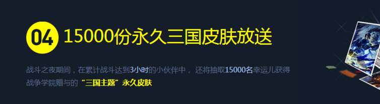 7另外官方为战斗3个小时的玩家,还准备了15000份三国皮肤,三国皮肤一般要200块钱,要是有机会获得三国皮肤,我们就可以在好友面前得瑟了。