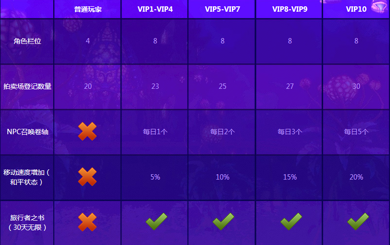除了VIP会员的特权外,额外赠送30天无限使用的旅行者之书(价值640点券),8个角色栏位,拍卖场登记数量30个,和平时移动速度增加20%,每日赠送5个NPC召唤卷轴。