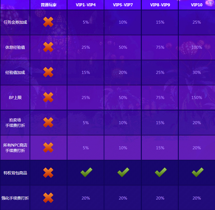 除了VIP会员的特权外,额外提高完成任务的金券奖励加成25%,休息经验值+100%,经验值加成30%,BP上限+150%,拍卖手续费、NPC手续费、强化手续费打折20%。