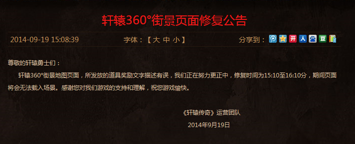 轩辕360°街景地图页面,所发放的道具奖励文字描述有误,我们正在努力更正中,修复时间为15:10至16:10分,期间页面将会无法载入场景。感谢您对我们游戏的支持和理解,祝您游戏愉快。