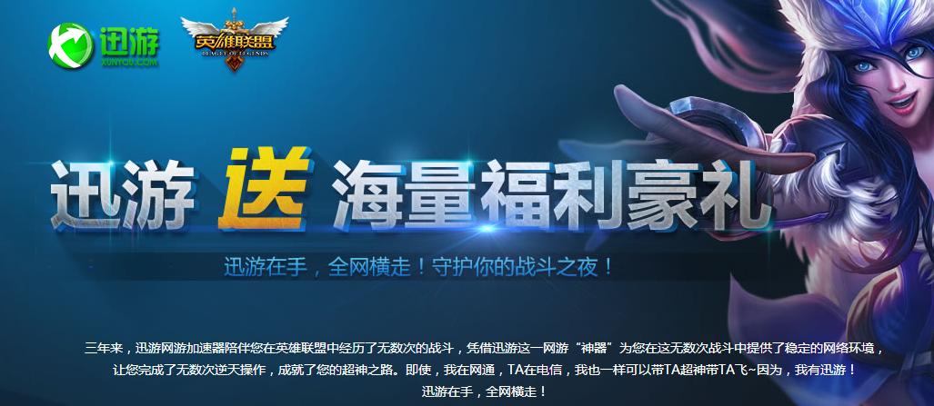 lol三周年,迅游网游加速器免费加速,2014年9月18日16:00 - 9月22日16:00活动期间,所有用户都可以免费使用迅游lol专版加速器,还有幸运用户奖励,下面一起来看看活动情况吧。