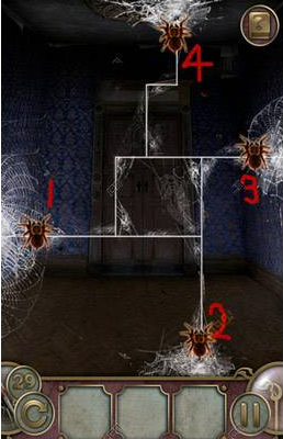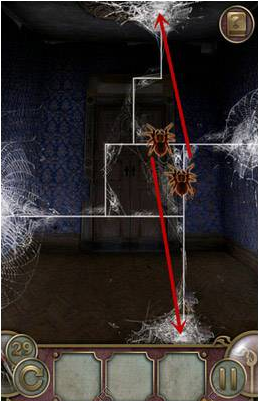 首先移动3号蜘蛛,一直移动到箭头所指的位置就可以逃出去了,之后再移动2号蜘蛛,让这只蜘蛛从4号蜘蛛达到1好蜘蛛初始位置逃这样就可以逃出界面,等到四只蜘蛛全部逃出之后,大门就可以打开,我们就可以成功脱出了。
