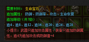 追加属性需要生命宝石,防御、防御率、攻击、生命恢复这些都是可以追加的哈,武器只追加攻击属性、装备只追加防御属性,追4为追加攻击或防御值+4,追的等级越高装备越高级。