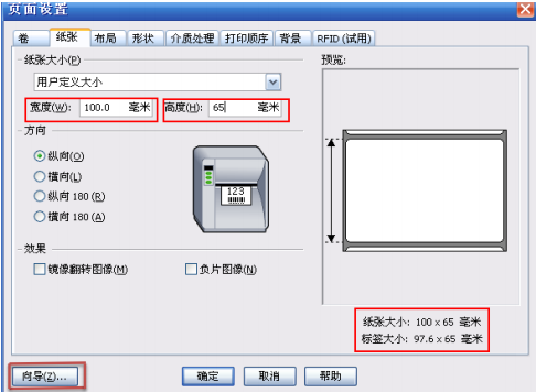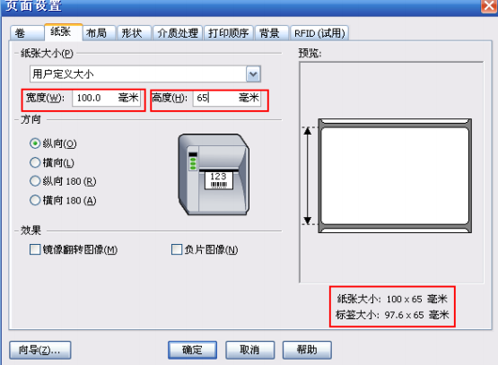 2. 核对软件中的标签设置。在标签空白处双击,弹出“页面设置”窗口,测量实际使用的标签宽度和高度,其中宽度是指底纸的宽度,高度是指实际粘贴的标签高度,不包括上下间隙值在内。设置完成可查看右边的预览标签参数,如果与实际参数有出入请按照步骤“5”再次修改。