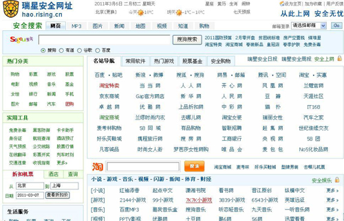 许多用户在谈论网址导航站的时候,还提到了一个新推出不久的安全网站这是一家安全厂商推出的导航网站,其“安全”概念是吸引用户尝试体验的主要诱因。该网站主要针对目前泛滥的钓鱼网站、挂马网页等网络威胁而专门设计,其中收录了网民常用的软件下载、网银、炒股、网游等多种涉及网民财产的网址,这些所有链接均经过瑞星官方检测、人工审核,对病毒、挂马网站、钓鱼网站能够实现有效拦截。