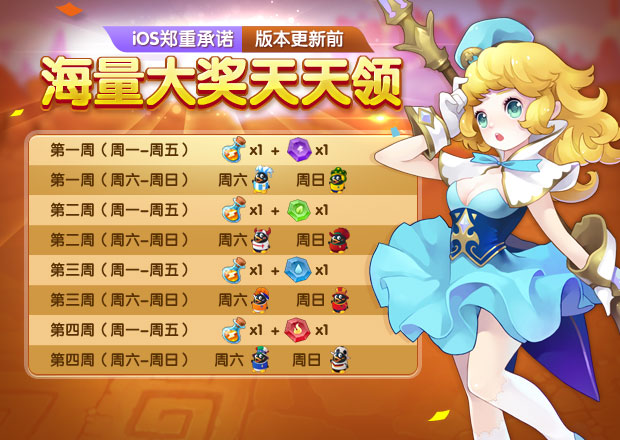 因全新的内容需要很长的审核时间,所以ios版本暂时未能及时更新,我们正竭诚与苹果方面保持积极沟通,力争让新版尽快通过苹果审核早日与玩家见面。同时,为了感谢ios玩家的热情支持,在ios新版未发布之前, ios的玩家每天只要上线登录游戏,即可获得专享福利!