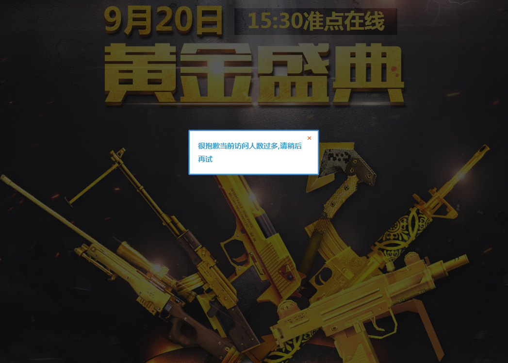 今天不少小伙伴都遇到了登陆cf9月20日黄金盛典活动页面显示“当前访问此页面人数过多,请稍后再来”的提示,这是什么情况呢?还能不能愉快地领取奖励了?其实,有小伙伴就说了这是服务器应付不过来了来啊!建议小伙伴们等人少的时候再上吧!可问题的关键是什么时候才会人少呢?