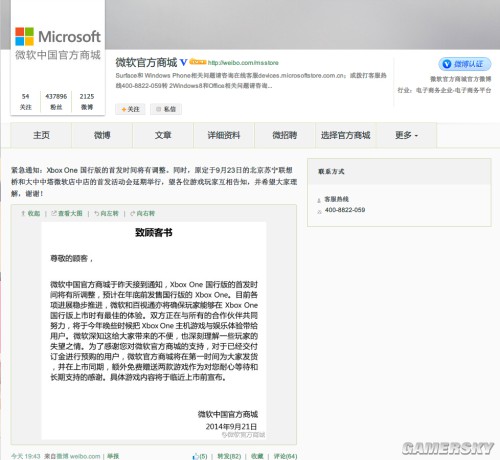 昨日,微软正式宣布国行Xbox One将延期发售,同时原定于9月23日的微软北京店中店的首发活动会也临时取消。而就在一小时前,@微软官方商城在微博上又公布了新的进展,称“原定于9月23日的北京苏宁联想桥和大中中塔微软店中店的首发活动会延期举行。”