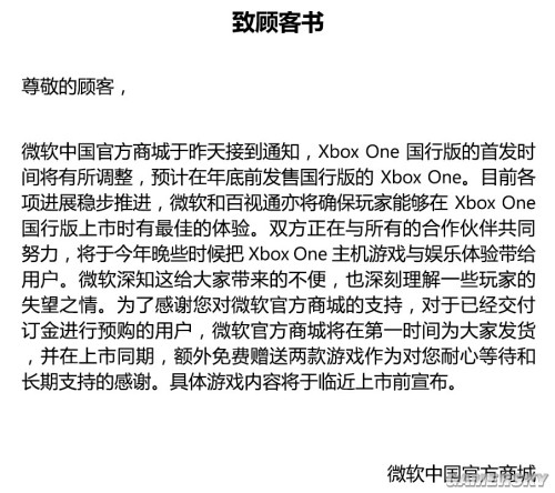 本来预定在9月23日的国行Xbox One发售因为未知原因延期了,这让广大玩家非常的失望,为了弥补玩家的损失,官方发布了致顾客书,对所有已经预定了的用户免费补偿两款游戏。