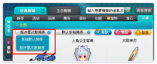 非卖专区的道具默认是按照系统排序的,你也可以手动选择“按许愿次数排序”,看看其他的玩家都在关注哪些道具。如下图所示: