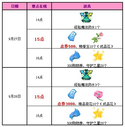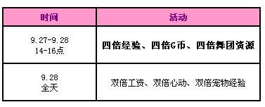 9月27日-9月28日每天14-16点开启四倍经验、四倍G币、四倍舞团资源活动。9.28全天将开启双倍工资、双倍心动、双倍宠物经验活动。