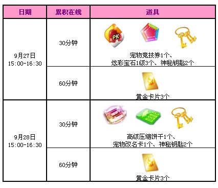 活动期间累积在线满足活动要求,即可轻松抱走宠物道具、1级宝石、神秘钥匙等好礼。