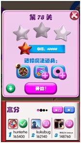 2) 在每一关所显示的高分排行以及自己的排行,点击“第一”可以看该关卡高分前三名,点击“我”可以看到我的排行以及分数: