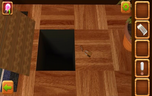 在画面的左边地板上有块地毯,点击将地毯移开,下面有个暗格。
