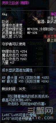 我们再来看看灵跃武器,虽然这个东西小伙伴们早就很熟悉了,不过我们还是要来看看的。下图的武器应该是最基础的那个灵跃武器了,最高等级是67,而且还是有期限的。属性除了附加伤害和血蓝量之外,并没有其他的。