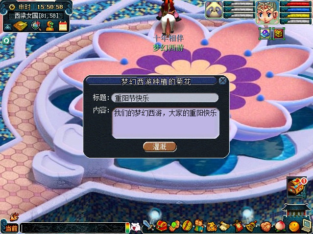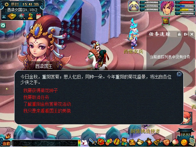 玩家可以在活动时间内找西梁国王,选择选项"我要获得菊花种子",领取任务,完成任务获得菊花种子。菊花种子可以在西梁女国种植出菊花幼苗,点击他人种植的菊花幼苗可以灌溉它。接受三次灌溉的菊花幼苗将开放成美丽的菊花哦。种植菊花种子和浇灌他人种植的菊花幼苗都奖励。
