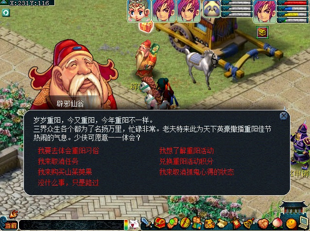 在活动期间,玩家(等级≥30)可以组队去长安城(230,120)找到辟邪仙翁领取任务,感受重阳节日的各种风俗和节日气氛。