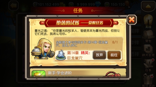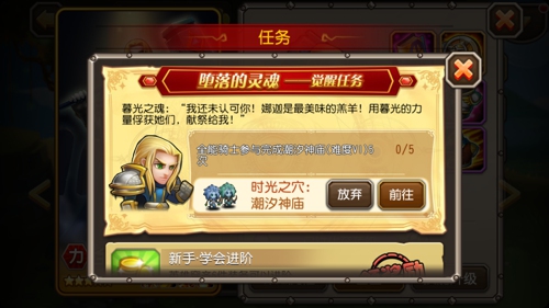 为英雄合成觉醒装备后即可开启觉醒任务。全能骑士觉醒首先要完成难度6潮汐神庙五次。相信对于战队已经90级的队长们来说不是什么难题。第三节任务则是全能骑士参与完成第14章巨龙巢,且无人阵亡。这对于全能辅助的超级奶爸来说无人死亡是妥妥的。