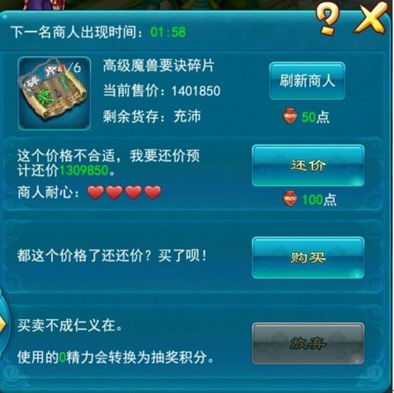 放弃:还价不如愿你也可以选择放弃交易,放弃交易后,还价成功所消耗的精力都会转成抽奖积分。注意放弃次数多了,神秘商人将不再和你交易哦!