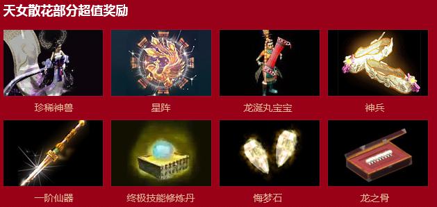 “天女散花”绝对是“红包节”的一枚重磅炸弹,只要在线就有奖。其中超值奖励不乏有年、画中仙、白泽等珍稀神兽,更有效果强大珍稀星阵,以及价值不菲的神兵等等。不要杀怪,不要购买,只要你在线站着发呆,就有几率将大奖收入囊中。