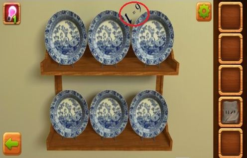 最右边的墙上有一排碟子,点击可以看到这里有个符号,也就是说刚才那个纸条上那个字符第二个是9。