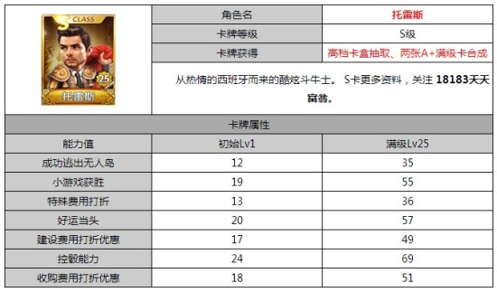 天天富翁于2014年9月23日新增了5位S级卡,小编看到有玩家在天天富翁S卡怎么得 天天富翁新增5位S级卡获得方法的下方留言,问天天富翁托雷斯怎么样的问题,鉴于此,小编接下来就为大家带来天天富翁S级卡托雷斯属性介绍,另外为大家带来天天富翁S级卡托雷斯蓝冰对比一览,希望对大家有所帮助啦!