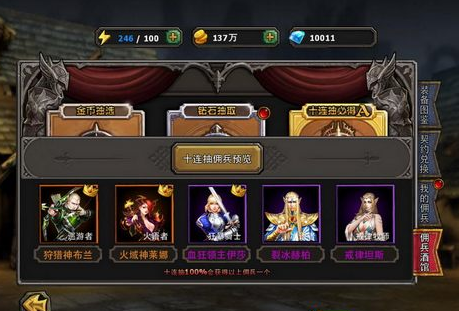 钻石十连抽:一次抽取10个佣兵,同时必得一个紫色品质佣兵(有机会获得金色佣兵)。