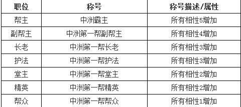 7、每届比赛最后一场比赛结束后(第二周的周三晚上23:59:59),占领城池数量最多且≥2的帮派,将成为中洲霸主帮派,产生中洲霸主帮派,帮派成员会获得称号奖励(称号属性在跨服战斗中不生效,限时2周)