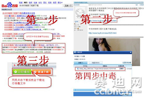 目前,最新的“中关村艳照门”病毒就是利用这种方式,让用户“主动”下载病毒的,用户搜索“中关村艳照门视频下载”关键字后,在首页前几名的搜索结果中,就会访问到恶意网站,从而下载含有病毒的播放器,导致电脑中的杀毒软件被病毒强制关闭、浏览器首页被恶意篡改、不断下载盗号木马病毒,盗取用户电脑中的各类账号密码信息以及图片视频文件。