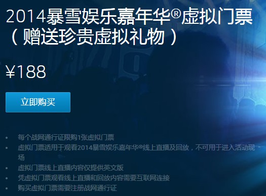 果不其然,在今天早些时候,战网商城添加了嘉年华虚拟门票选项,售价188RMB,购买的玩家可以获得暴雪旗下游戏的虚拟道具奖励。
