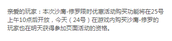 5、活动截止前,在游戏内购买沙鹰修罗也可以在页面参加活动。若在游戏内购买,礼包领取资格和抽奖资格将在第二天发放。