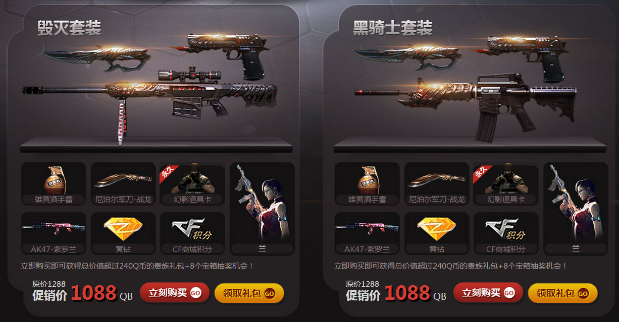 毁灭修罗套装(Barrett-毁灭+沙鹰-修罗),原价1288Q币,优惠价1088Q币。可以使用88Q币英雄武器代金券。