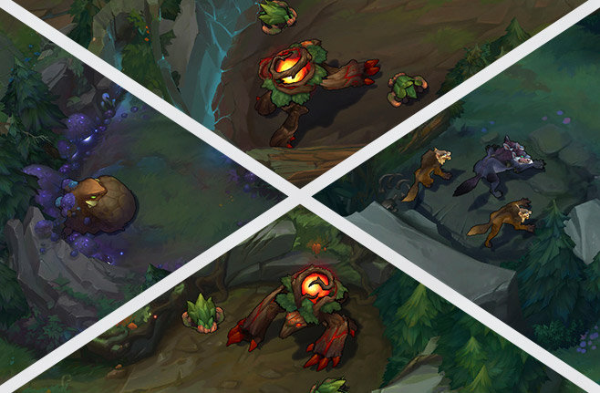 说到野区,有一批全新的野怪在召唤师峡谷安家,它们的动作更能反应它们各自的个性。例如,石甲虫(取代了双石像)的岩石表层,看起来更像是吸收伤害的小型坦克——而且它们看上去就弱于笨重的苍蓝雕纹魔像。