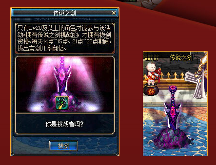 活动期间,玩家帐号内Lv20及以上的角色首次登录时会得到1张系统赠送的【传说之剑挑战函】,拥有挑战函才能参与拔剑;
