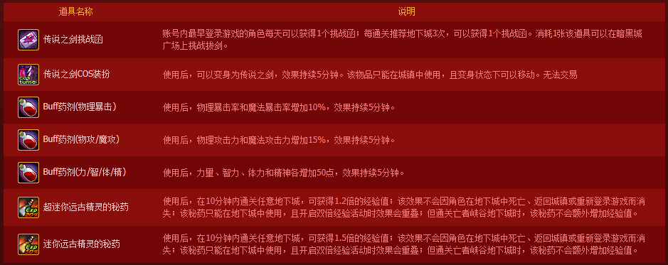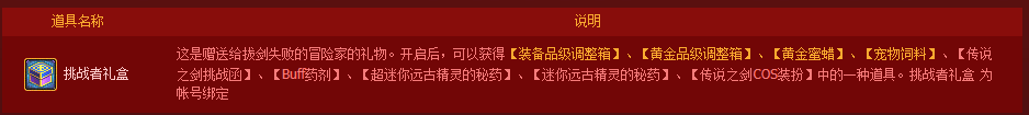3.【传说之剑挑战函】为帐号绑定,【挑战者礼盒】、【传说之剑挑战函】、【传说之剑COS装扮】、【超迷你远古精灵的秘药】、【迷你远古精灵的秘药】以及【Buff药剂】将于2014年10月16日凌晨6:00统一删除,请及时使用;