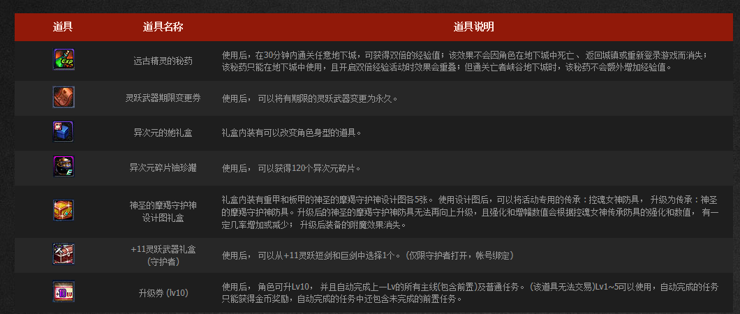 *【+11灵跃武器礼盒 (守护者)】、【异次元碎片袖珍罐】、【升级券 (lv10) 】、【神圣的摩羯守护神设计图礼盒】为帐号绑定,其余道具均无法交易。【灵跃武器期限变更券】可以将玩家新建守护者角色时获得的有期限灵跃武器变为永久武器。