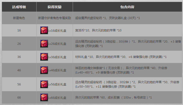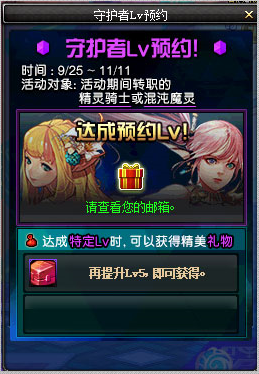 玩家任意守护者职业角色在转职精灵骑士或者混沌魔灵后达Lv16、Lv26、Lv36、Lv46、Lv56、Lv66时可以获得成长奖励!