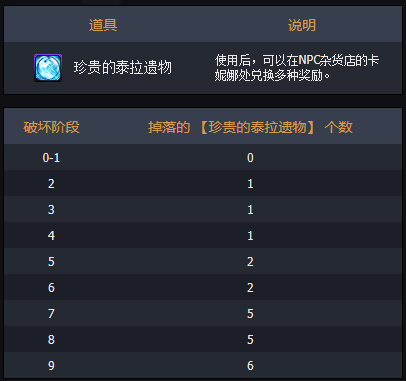 规定时间结束后,根据玩家对怪物的破坏程度,地下城内怪物会掉落数量不等的【珍贵的泰拉遗物】。