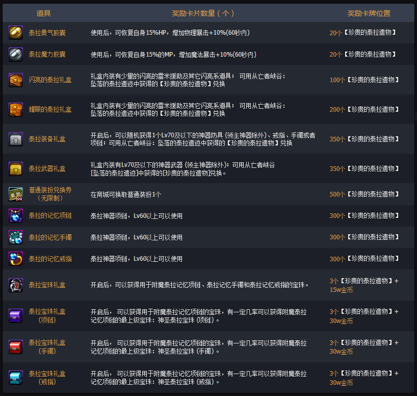 5.【遗迹调查资格证】、【遗迹探险资格证】、【珍贵的泰拉遗物】、【闪亮的泰拉礼盒】、【耀眼的泰拉礼盒】、【泰拉武器礼盒】、【泰拉装备礼盒】、【泰拉宝珠礼盒】、【泰拉宝珠礼盒(项链/手镯/戒子)】将于2014年10月16日凌晨6:00统一删除;