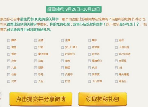 9月26日至10月10日期间,在活动页面点击参与按钮,即可参与票选。票选问题是:你心目中最能代表QQ炫舞的关键字。