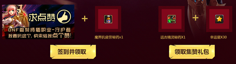 活动期间,使用dnf指定内容签到可以获得游戏大礼包一份!签到成功,在空间集好友10个赞,即可领取dnf集赞礼包,单个QQ号每个礼包限领一次。