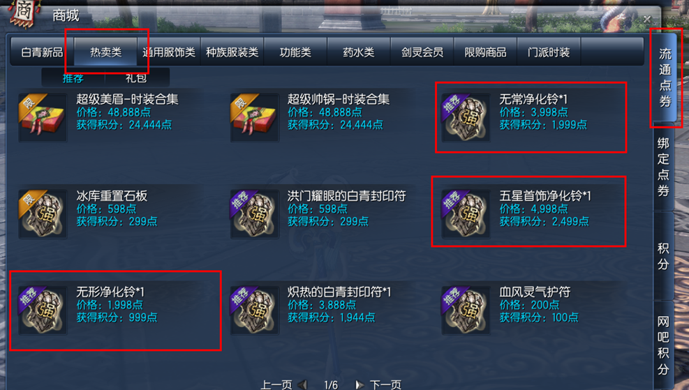 按F10打开商城,在热卖类商品页面可以找到全部净化铃道具,点击详细查看即可购买~