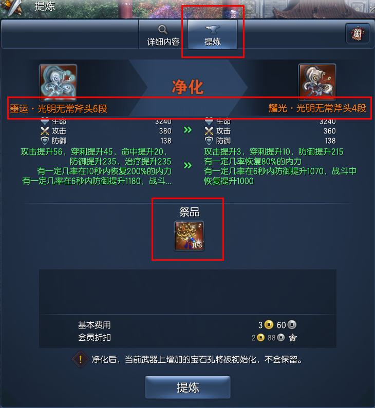 点击需要净化的噩运装备进入提炼窗口,拥有相应数量的净化铃与金币即可净化噩运装备。