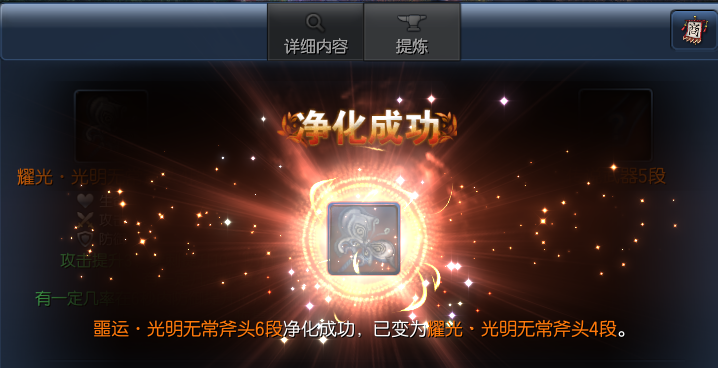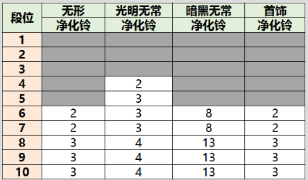 同时,不同段位的噩运装备净化后得到的装备段位也是不同的,其中2-4段噩运装备净化为1段耀光装备,5-7段噩运装备净化为4段耀光装备,8-10段噩运装备净化为7段耀光装备。